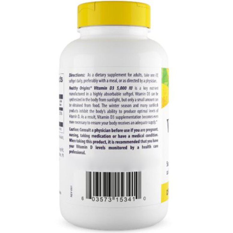 A Healthy Origins Vitamin D3 Depot kapszula természetes eredetű D3-vitamint (cholecalciferol) tartalmaz, amely lanolinból származik. A termék minden egyes lágyzselatin kapszulája 5000 NE (125 mcg) D-vitamint biztosít.