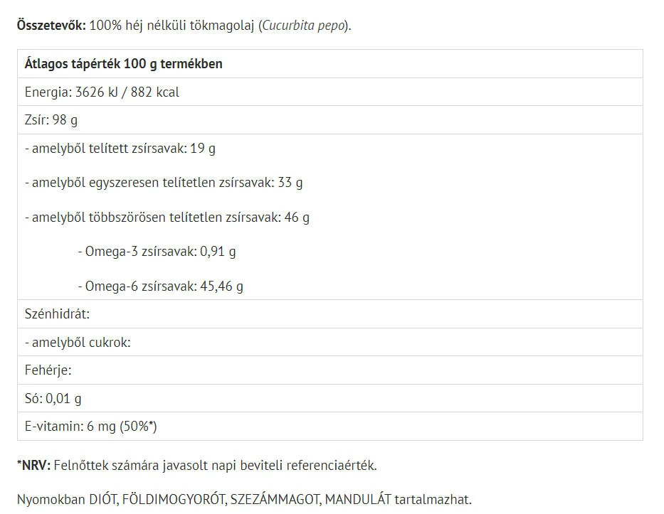 A termék egyetlen fő összetevője a gondosan válogatott, magas minőségű tökmagból sajtolt olaj.