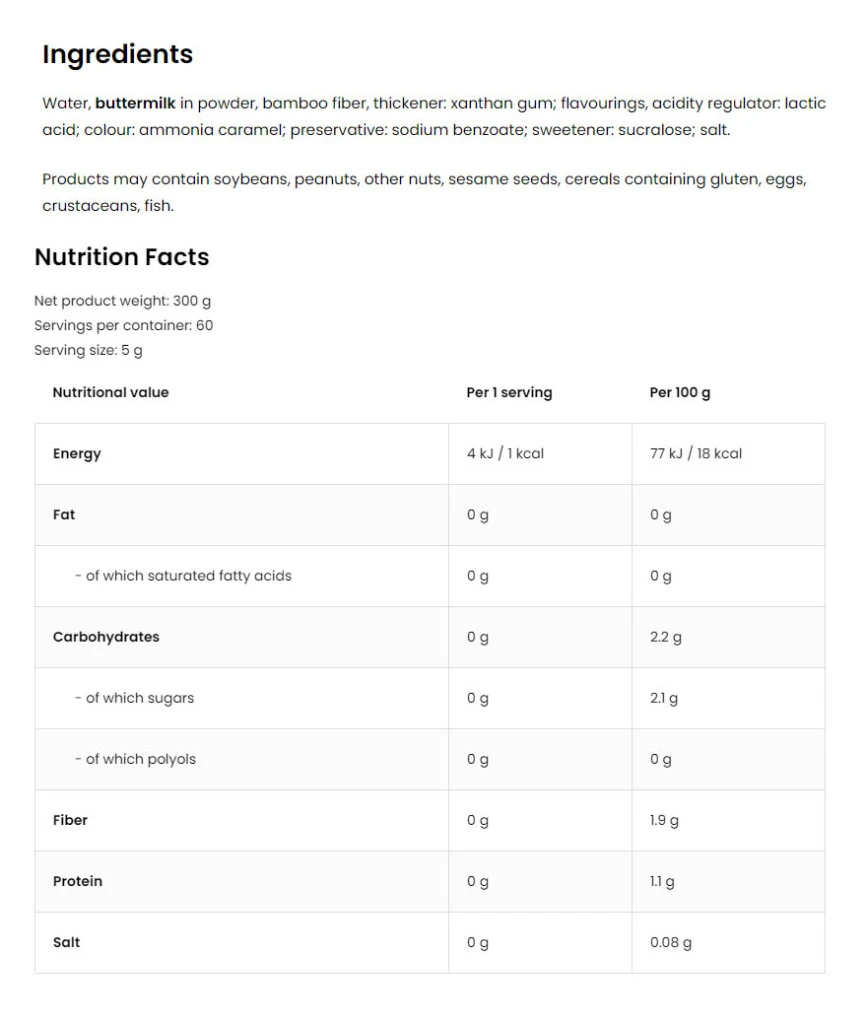 A sauce természetes aromákkal van gazdagítva, hogy hűen tükrözze a klasszikus tiramisu desszert ízeit. A pontos összetevő lista megtalálható a csomagoláson.