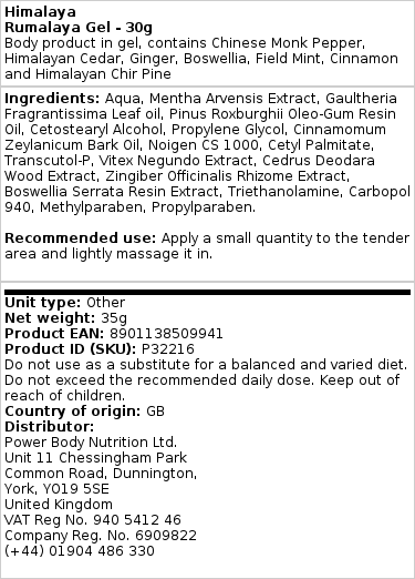 Aqua, Mentha Arvensis kivonat, Gaultheria Fragrantissima levélolaj, Pinus Roxburghii Oleo-Gum gyantaolaj, Cetostearyl Alcohol, Propylene Glycol, Cinnamomum Zeylanicum kéregolaj, Noigen CS 1000, Cetyl Palmitate, Transcutol-P, Vitex Negundo kivonat, Cedrus Deodara fa kivonat, Zingiber Officinalis rizóma kivonat, Boswellia Serrata gyanta kivonat, Trietanolamin, Carbopol 940, Methylparaben, Propylparaben.