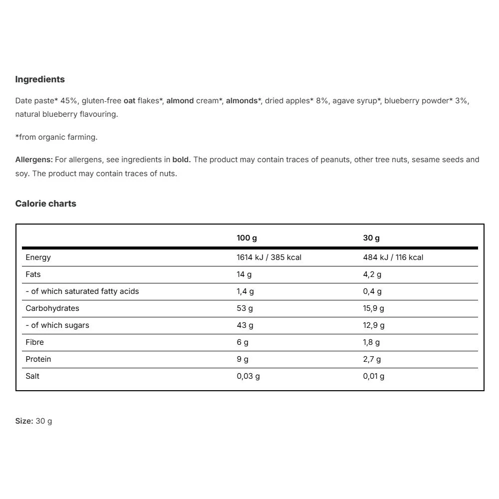 A termék alapját képezik az érett áfonyák és friss almák, melyeket gondosan válogatnak ki a legjobb minőség érdekében. A finom ízvilág mellett ezek az összetevők hozzájárulnak az energiagolyó kellemes állagához is.