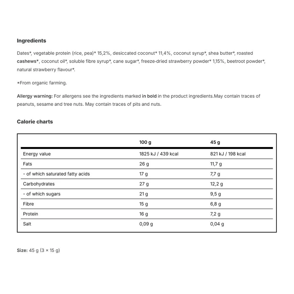 A termék gazdag organikus növényi fehérjében, valamint ízletes eper és kókusz darabokban. Ezek az alapanyagok gondosan vannak kiválasztva, hogy támogassák a minőségi táplálkozást anélkül, hogy egészségügyi állításokat tennénk.