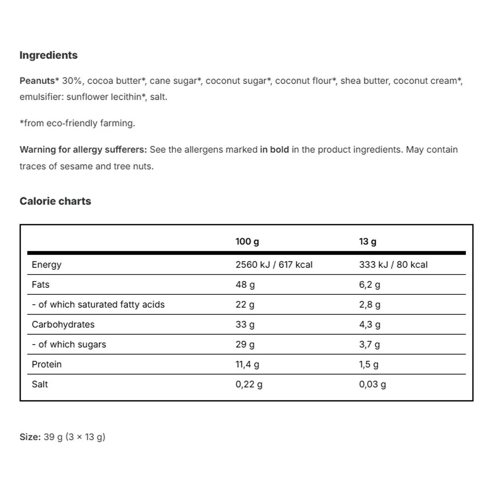 A termék alapját képező bio mogyoróvaj és minőségi fehér csokoládé tökéletes ízvilágú snacket alkotnak. A hozzáadott cukrok nélküli receptúra garantálja az autentikus ízek érvényesülését.